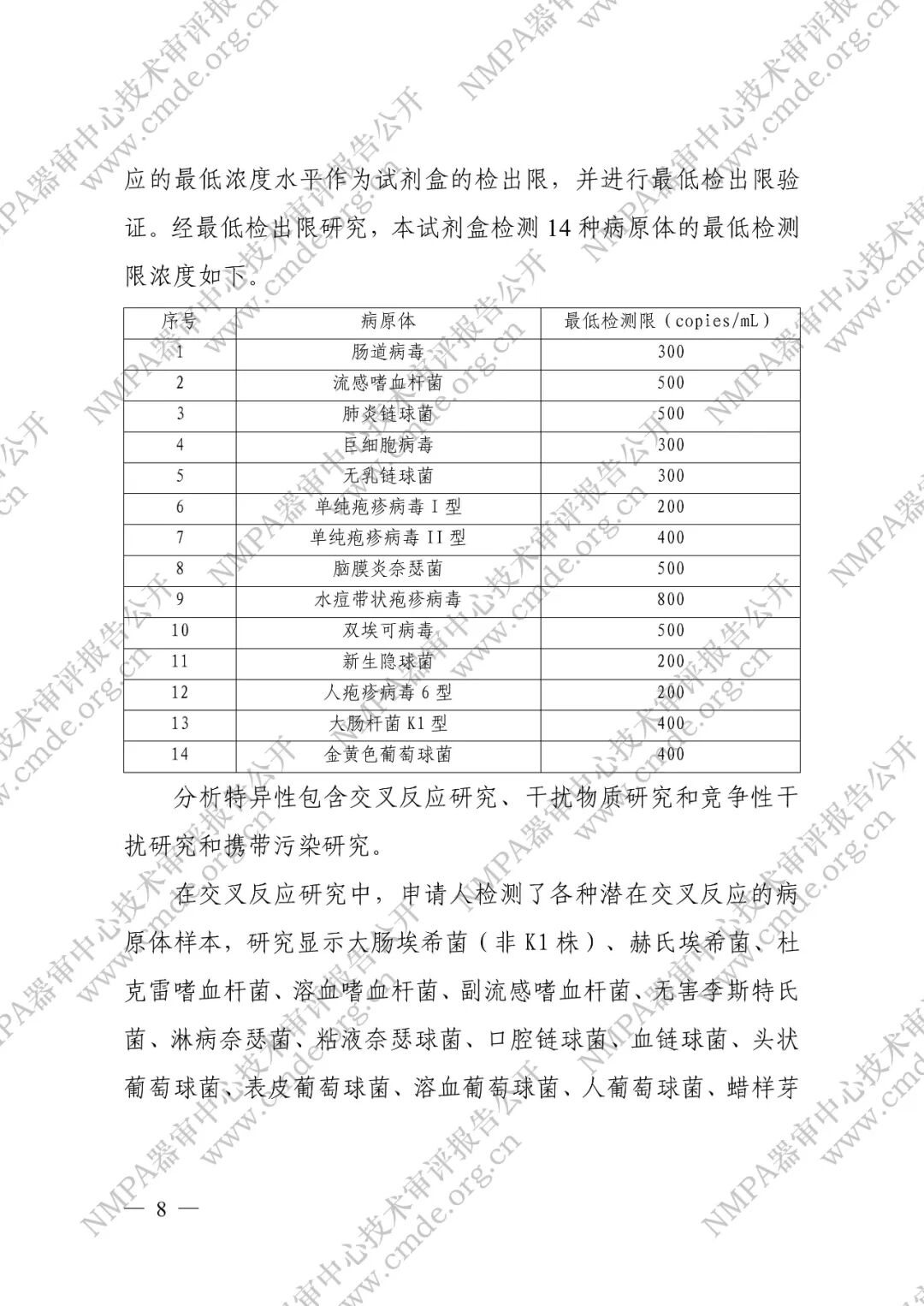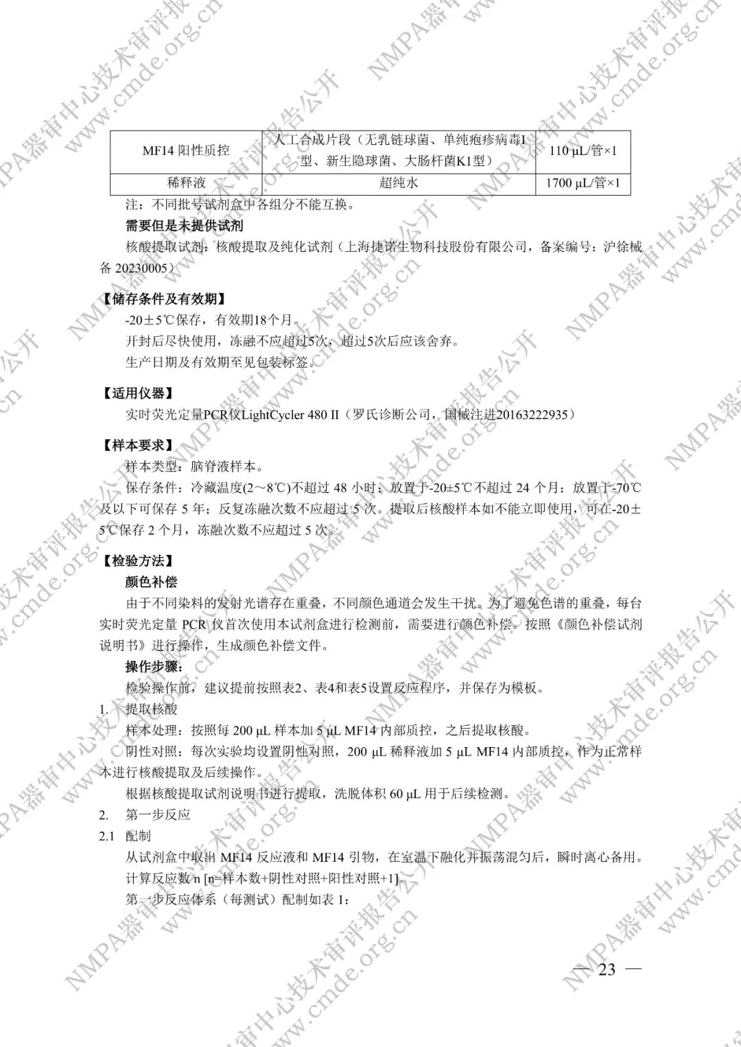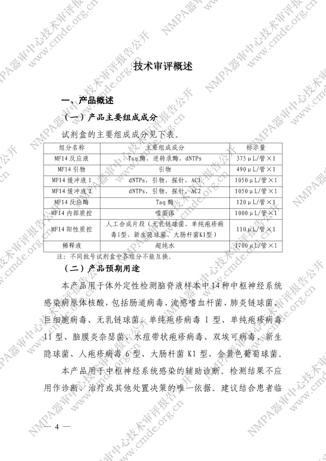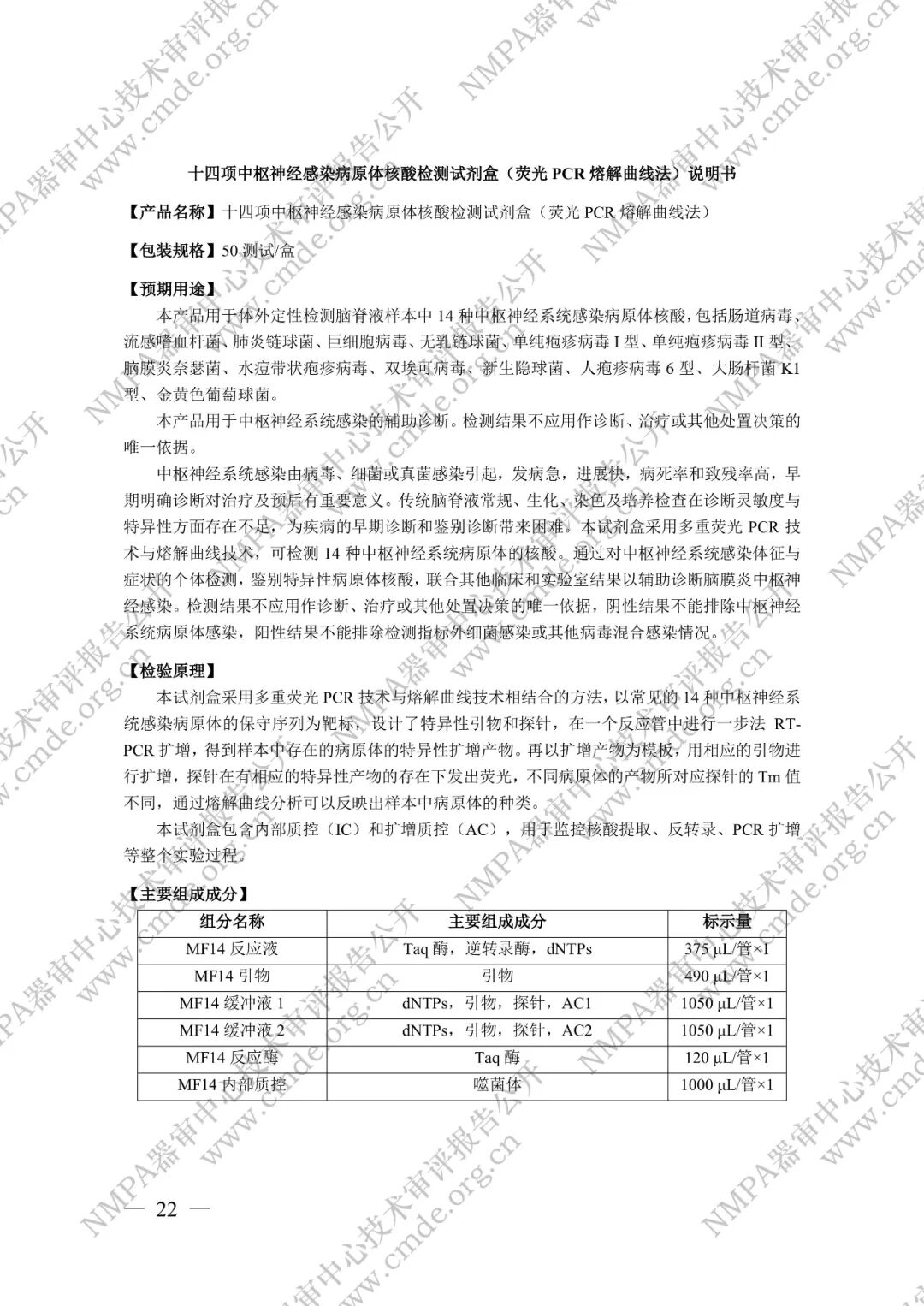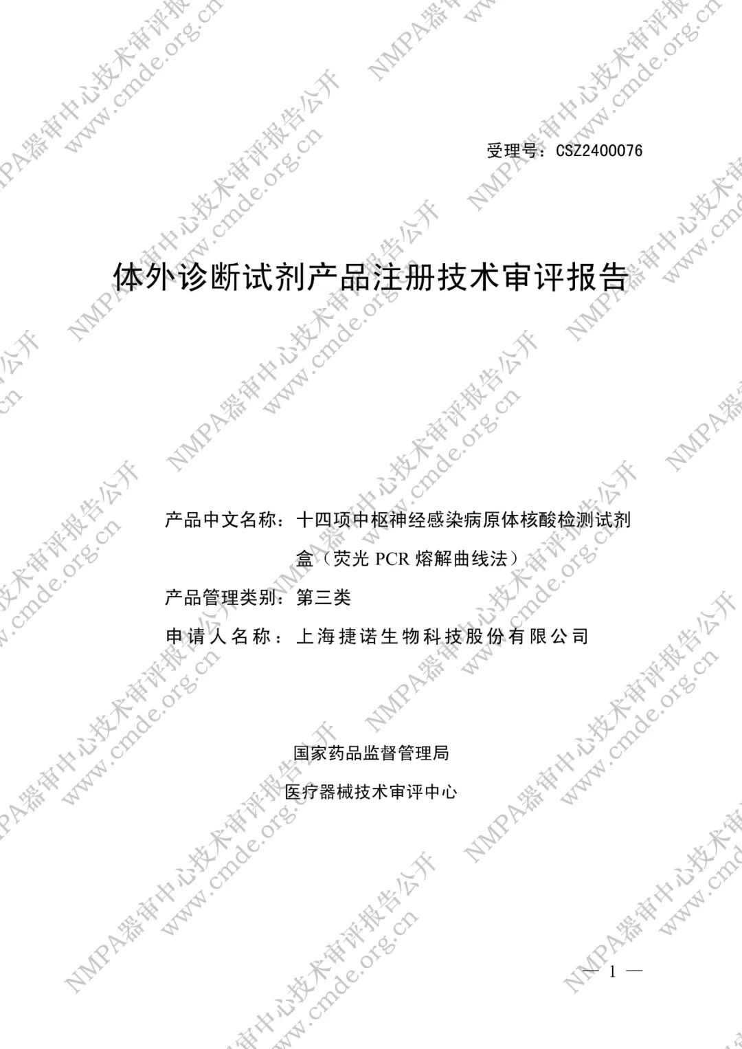 国家药品监督管理局医疗器械技术审评中心8月公开《十四项中枢神经感染病原体核酸检测试剂盒(荧光 PCR 熔解曲线法)》产品注册技术审评报告。申请人:上海捷诺生物科技股份有限公司。