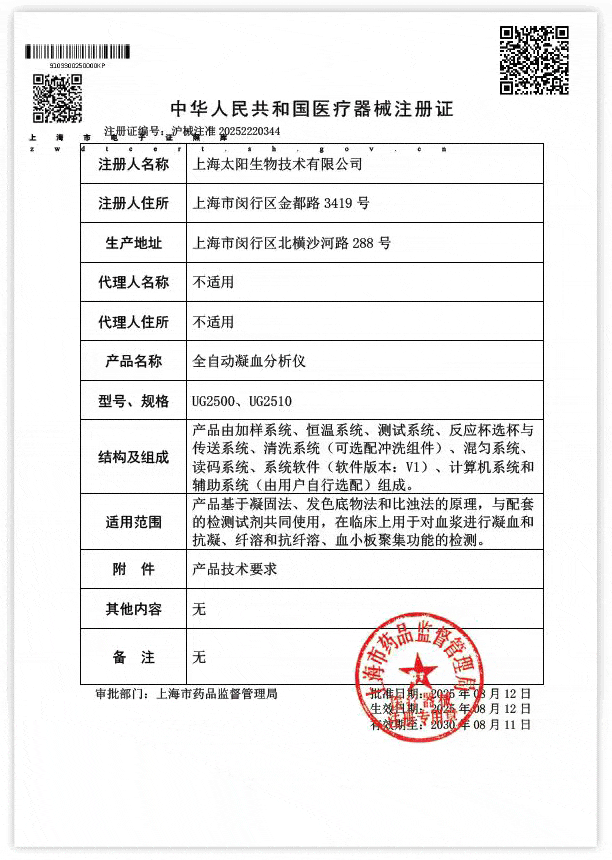 近日,上海太阳生物连续收获两款医疗器械注册证:UG2500全自动凝血分析仪获得上海市药监局批准,蛋白C测定试剂盒获得国家药监局批准。