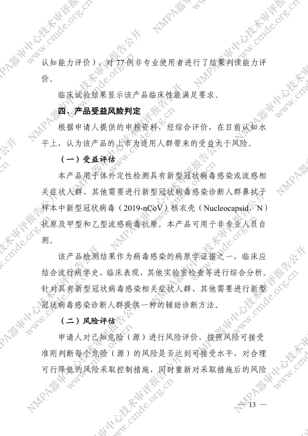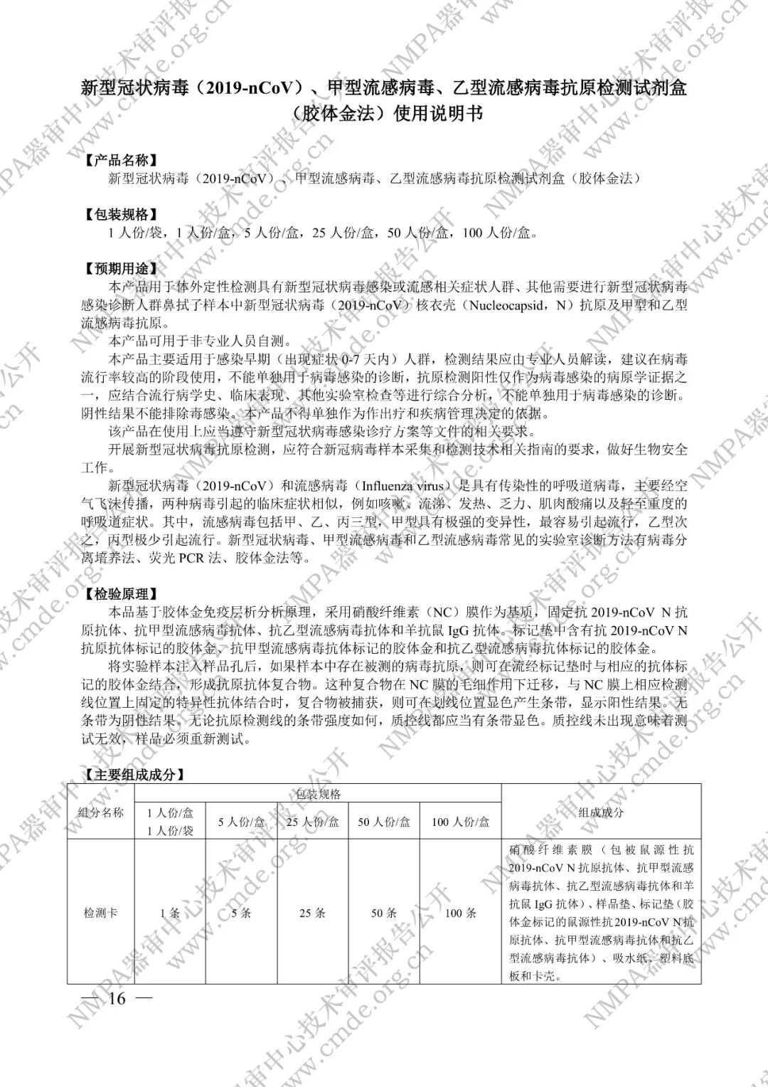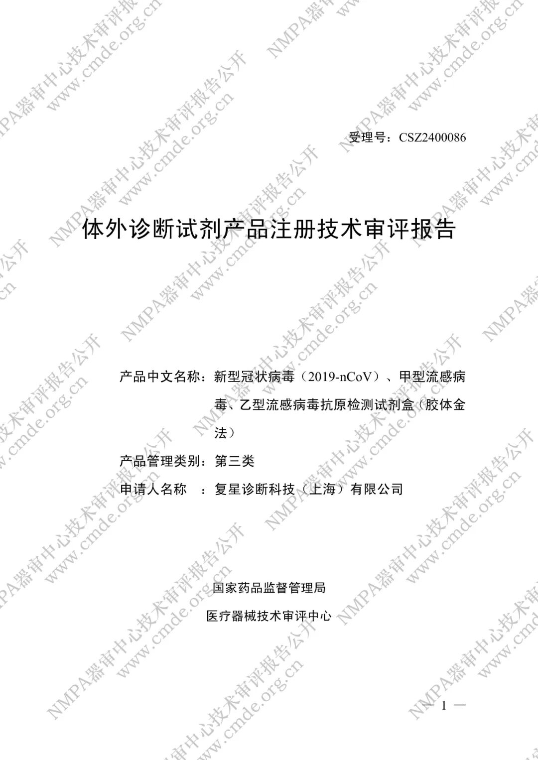 国家药品监督管理局医疗器械技术审评中心8月公开《新型冠状病毒(2019-nCoV)、甲型流感病毒、乙型流感病毒抗原检测试剂盒(胶体金法)》产品注册技术审评报告。申请人:复星诊断科技(上海)有限公司。