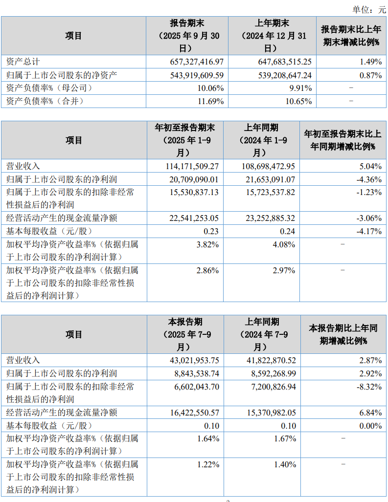 10月29日,宁波新芝生物科技股份有限公司发布了2025年三季报,公告显示,2025年第三季度企业营收0.43亿,同比增长2.87%,年初至报告期末营收1.14亿,同比增长5.04%;第三季度净利0.09亿,同比增长2.92%,前三季度净利0.21亿,同比减少4.36%。