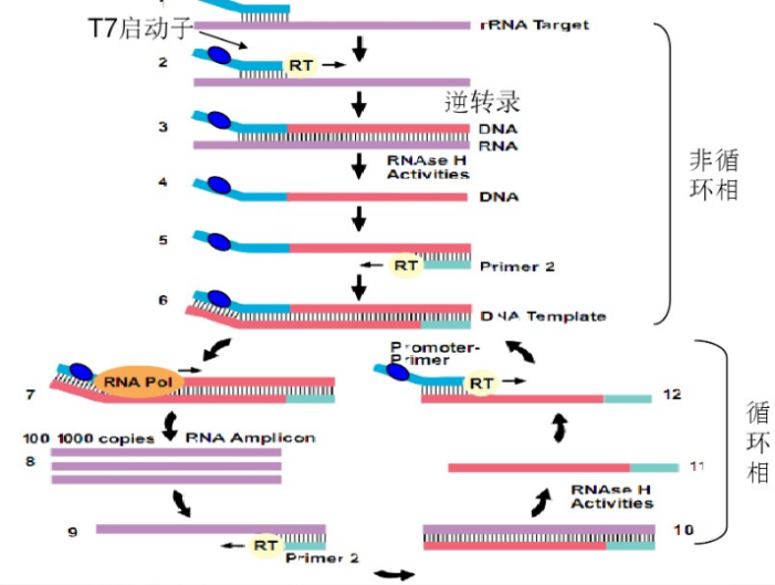 同样为恒温扩增技术的还有转录介导的扩增技术(transcription mediated amplification,TMA),该技术由Gen-Prob研发,利用T7 RNA聚合酶和逆转录酶在约42℃等温反应条件下扩增样本。其原理是逆转录酶利用带有T7启动子的引物将RNA样本逆转录成cDNA,然后RNaseH将cDNA-RNA杂链中RNA消化后,T7 RNA聚合酶可将含有T7启动子的cDNA转录成RNA,一分子DNA模板转录得到100-1000拷贝的RNA,而这些RNA又再次进入反应成为TMA的起始模板。如此循环,RNA称指数增长,在15-30min内将靶序列扩增1010左右。