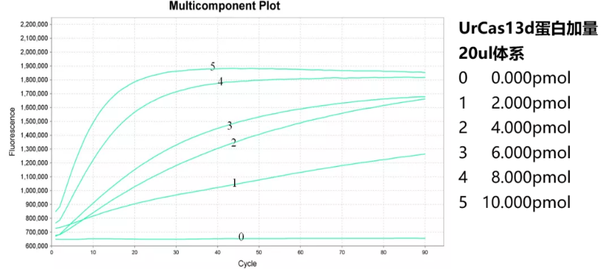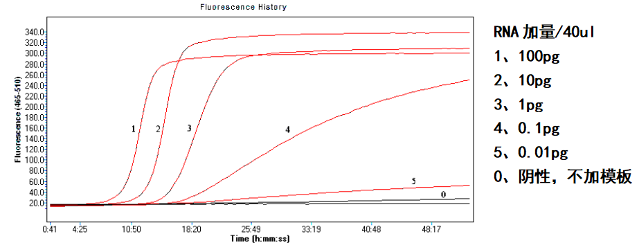 近岸蛋白质经过系列优化调整,完成了TMA的实时荧光检测,对RNA模板进行梯度稀释后进行TMA扩增,结果可对0.1pg RNA实现有效扩增。