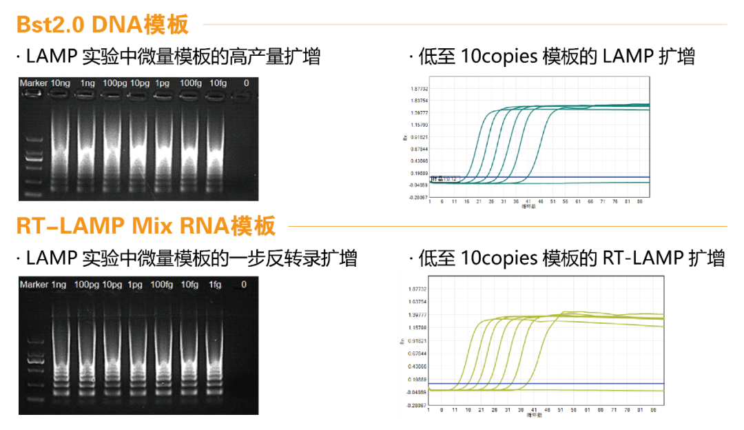 针对DNA或RNA病毒类型,LAMP方法均可达到理想的检测结果。近岸蛋白质BST 2.0及RT-LAMP试剂经过多方验证,能够高产扩增极低量DNA、RNA。